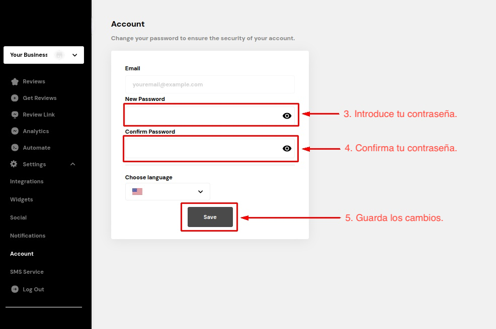 • Guardar cambios: haga clic en el botón «Guardar» para aplicar los cambios y actualizar su contraseña.